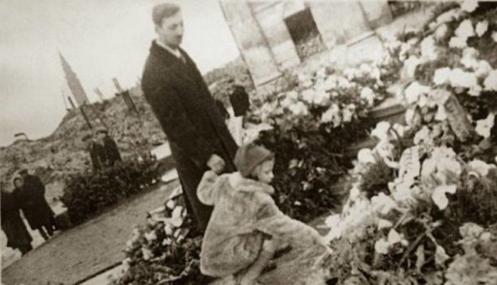 WARSAW, POLAND - 1945: Marek Edelman - Polish-Jewish social activist and cardiologist, last surviving leader of the Warsaw Ghetto Uprising, laying flowers on the ruins of Warsaw Ghetto in 1945. Photograph from Marek Edelman's archive. (Photo by Laski Diffusion/Getty Images)