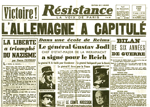 NB : la ratification de la capitulation à Berlin ayant été enregistrée en URSS le lendemain, à 00h01 (heure de Moscou), c’est le 9 mai que, depuis lors, Soviétiques et Russes commémorent leur victoire dans la « Grande Guerre patriotique ».