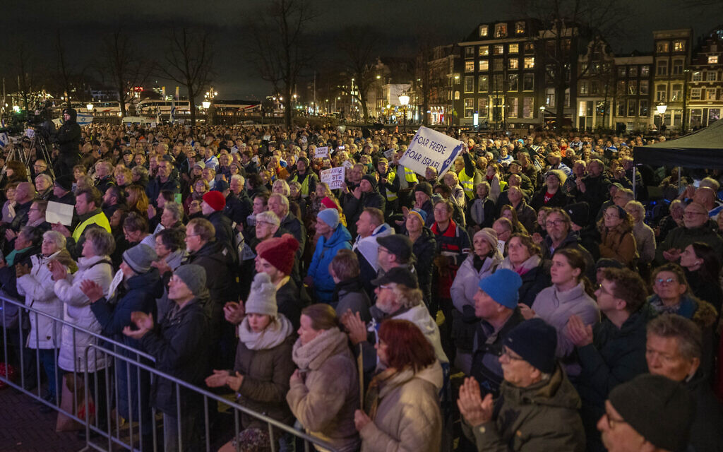 Le rassemblement s’est donc tenu devant la « Stopera », le complexe abritant l’hôtel de ville et l’opéra, non loin de la statue du philosophe Baruch Spinoza, figure emblématique de la pensée juive néerlandaise.