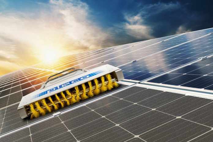 Le robot PLECO de BladeRanger utilise des brosses pour laver à sec un panneau solaire