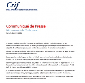 #Communiqué – « Le Crif est choqué et révolté par le détournement et la falsification des symboles de la persécution des Juifs durant la seconde guerre mondiale. »