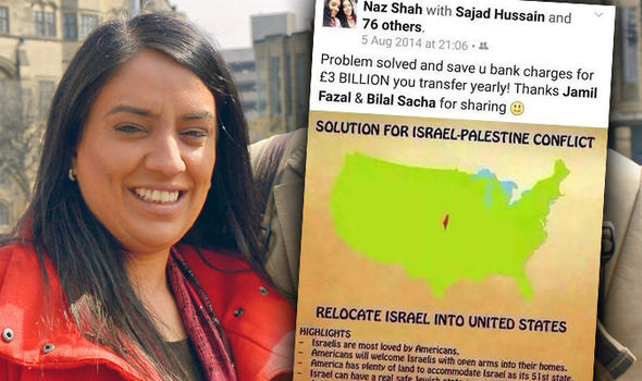 L’arrivée de Corbyn à la tête du parti a donné aux incitateurs antisémites, le sentiment que tout, désormais, leur était permis. L’une des déclarations les plus extrémistes qui aient été prononcées revient à la Députée Naseem « Naz » Shah, qui représente la circonscription de Bradford, un bastion musulman. Elle suggérait qu’Israël soit délocalisé aux Etats-Unis[14]. Shah a présenté ses excuses et s’est repentie de ses propos. Pourtant, elle a participé avec d’autres Députés à un événement récent organisé par des militants accusés d’antisémitisme[15].