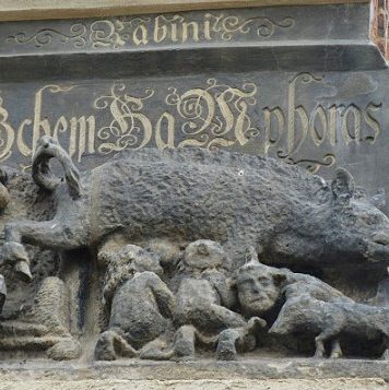 A huit mètres de hauteur, la « truie des Juifs » orne depuis le Moyen-Âge l’aile sud de l’Eglise Sainte-Marie de Wittenberg. Des Juifs et des porcelets tètent le lait d’une truie pendant qu’un rabbin soulève la patte et la queue de l’animal pour scruter son anus.
