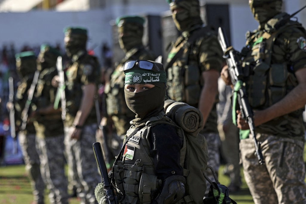 Sur la photo : des terroristes du Hamas avec leur enfant stagiaire lors d’un rassemblement dans la ville de Gaza le 24 mai 2021. (Photo de Mahmud Hams/AFP via Getty Images)
