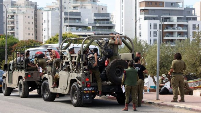 EDITORS NOTE: Graphic content / Israeli army reservists are transported in military vehicles to join their army base, south of Tel Aviv on October 7, 2023, Palestinian militants have begun a "war" against Israel, the country's defence minister said on October 7 after a barrage of rockets were fired and fighters from the Palestinian enclave infiltrated Israel, a major escalation in the Israeli-Palestinian conflict. (Photo by GIL COHEN-MAGEN / AFP)