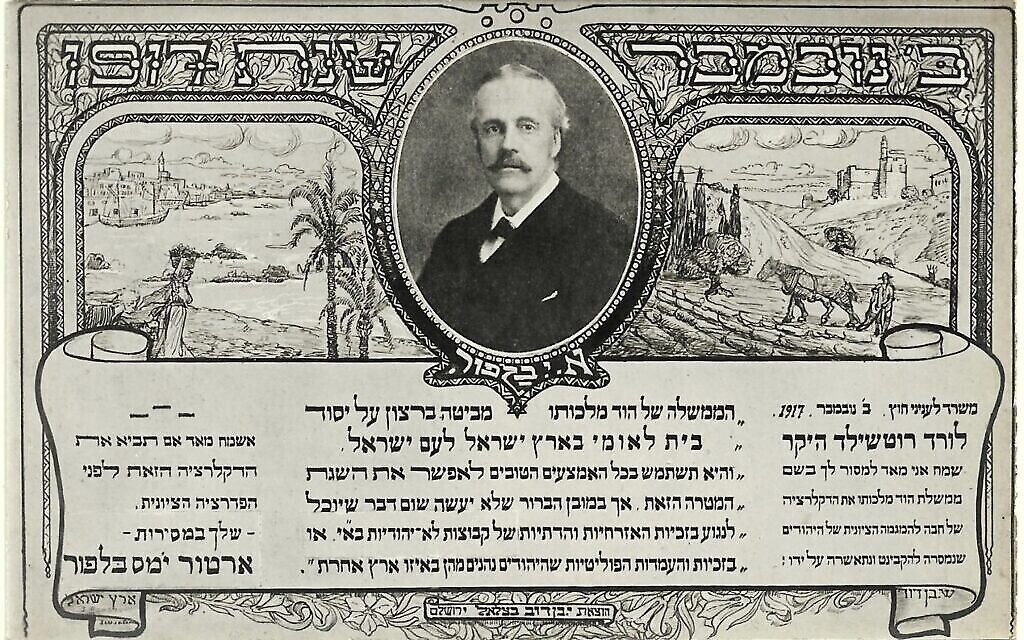 Carte postale avec la Déclaration Balfour en traduction hébraïque, publiée par Yaackov Ben-Dov, Bezalel, Jérusalem, créée par Shmuel Ben David (Davidov), vers 1917. (Crédit : Domaine public, via Wikimedia Commons)