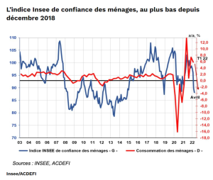 Le pire est que les indicateurs avancés de l’activité économique baissent nettement. A commencer par l’indice Insee de confiance des ménages qui, en avril, est tombé à un plancher depuis décembre 2018 et la crise des “gilets jaunes”. Dans ce cadre, et comme le montre le graphique ci-dessous, la consommation des ménages devrait encore régresser au deuxième trimestre 2022, engendrant une nouvelle diminution du PIB français pour le deuxième trimestre consécutif, ce qui signifiera un retour en récession pour notre “douce France”.