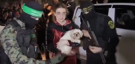 בסרטון השחרור נראה שיח מתוח בין מיאה ואיש חמאס שזיהה אותה יוצאת מהאוטו עם הכלבה. ״אחד החמאסניקים בא לקחת את בלה ואמר 'מה זה?' והיא ענתה לו 'היא שלי, מהבית'. היא סימנה לו – עד כאן, אל תיגע לי בכלבה. זה לא היה ויכוח, היא פשוט הבהירה לו באסרטיביות שהיא חוזרת איתה הביתה״>> pic.twitter.com/z7R9wWwILQ