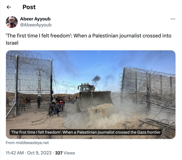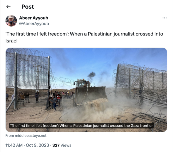 Le 9 octobre, elle a partagé un article méprisable du Middle East Eye, intitulé : « La première fois que j’ai ressenti la liberté » : lorsqu’un journaliste palestinien est entré en Israël.
