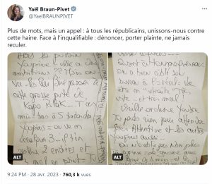 « Tu ne perds rien pour attendre, sois attentive et les autres youpins aussi », peut-on notamment lire dans cette lettre manuscrite. « T’as mis bas à cinq bâtards youpins : on va en décalquer trois, il t’en restera deux entiers et trois mal en point. Tu verras lesquels », ajoute l’auteur.