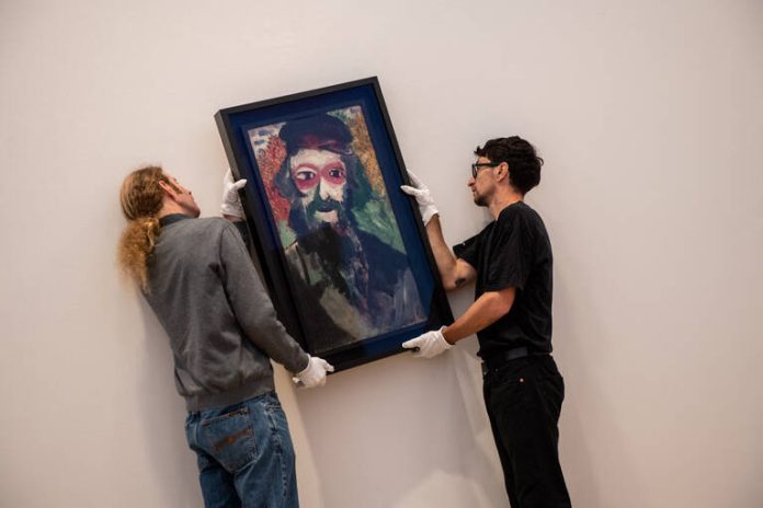 LONDON, ENGLAND - OCTOBER 06: Art handlers hold Le Pere, a portrait by artist Marc Chagall of his father, during a press preview at Phillips gallery on October 6, 2022 in London, England. Le PËre, a portrait by artist Marc Chagall of his father, was owned by a Polish violin maker who survived Auschwitz but it was seized from him and its whereabouts were unknown for many years. When it resurfaced, Chagall reacquired it for himself in 1966 and it went on to be exhibited in the most prominent museums around the world. The French government is taking action to restitute works of art back to the families and descendants of Jewish people whose homes were looted by the Nazis in WWII. Of the 15 works being restituted, Le PËre is the first to come to auction and is estimated at $6-8 million. It will be sold in New York in November 2022. (Photo by Chris J Ratcliffe/Getty Images) (Photo by Chris J Ratcliffe / GETTY IMAGES EUROPE / Getty Images via AFP)