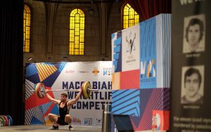 L’Israélien Yoel Slutzky soulevant une barre d’haltère pendant le segment de l’arraché de la compétition d’haltérophilie des Maccabiades à Jérusalem, le 19 juillet 2022. (Crédit : Judah Ari Gross/Times of Israel)