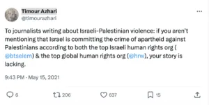Le premier a été publié pendant le conflit entre Israël et le Hamas en mai 2021, alors qu’Azhari était correspondant de Reuters au Liban. Il y conseille aux journalistes de mentionner qu’« Israël commet le crime d’apartheid contre les Palestiniens », sinon leurs articles seraient « incomplets ».