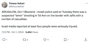 Les guillemets sont superflus en raison de l’attribution de l’attaque à la police israélienne. Le message est donc clair : pour Azhari, cette attaque brutale ne peut pas être qualifiée de terroriste.