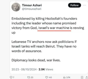 Et ici, il a qualifié Israël de « machine de guerre », oubliant peut-être que le Hezbollah est l’acteur non étatique le plus lourdement armé au monde :