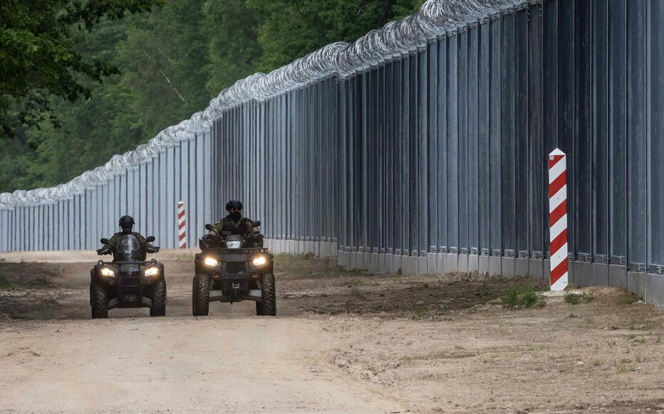 (FILES) In this file photo taken on June 08, 2022 border guards patrol on quads along the border wall at the Polish-Belarusian border near Tolcze village, in Sokolka County, Podlaskie Voivodeship, in north-eastern Poland. - Poland said on June 30, 2022 it had finished building a steel wall along the Belarus border to deter migrants, after it blamed Minsk for allowing in an influx to "destabilise" the region. Tens of thousands of migrants and refugees, mostly from the Middle East, have crossed or attempted to cross into Poland from Belarus since last summer. (Photo by Wojtek RADWANSKI / AFP)