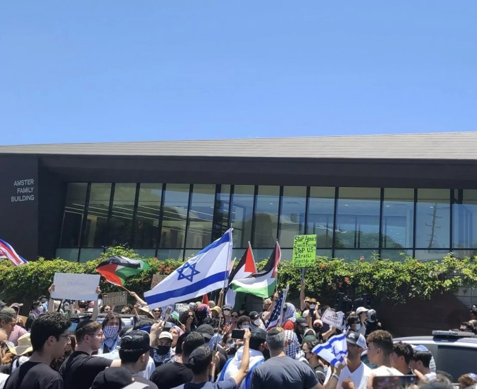 Jeudi, des partisans du Hamas se sont présentés à la congrégation Shaarey Zedek (Portes de la justice) dans la vallée de San Fernando, autrefois fréquentée par Ben Shapiro , criant des injures aux parents qui emmenaient leurs enfants à l’école. D’autres écoles juives ont été également ciblées.