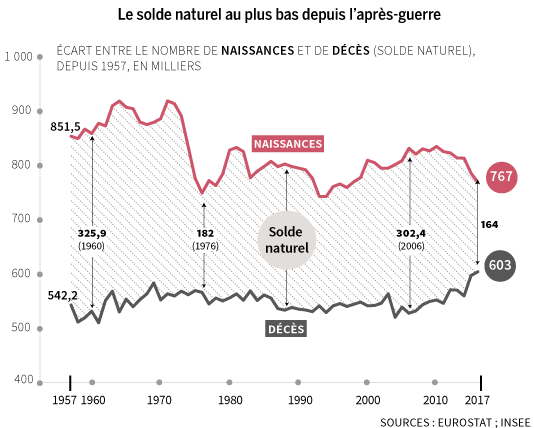 Le solde naturel, c’est-à-dire la différence entre les naissances et les décès est « historiquement bas » à + 164 000 personnes, au niveau le plus faible constaté depuis l’après-guerre (hors Mayotte).