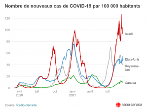 Israël a en ce moment le plus haut taux d’infection du monde; le taux dans ce pays est deux fois plus élevé qu’au Royaume-Uni et aux États-Unis. Au Royaume-Uni, le nombre d’hospitalisations continue d’augmenter et aux États-Unis, on dénombre actuellement près de 2000 décès par jour.