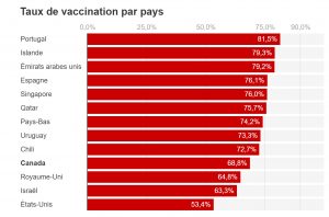 Selon le Pr Pakes, l’arrivée du variant Delta fait en sorte qu’il est nécessaire de vacciner 90 % de la population, y compris les enfants, pour arriver à contrôler la pandémie. Aucun pays dans le monde n’a atteint ce seuil. Seuls le Portugal, l’Islande et les Émirats arabes unis s’en approchent avec 80 % de leur population vaccinée.