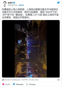 Aucun doute, pour le SCMP, les manifestations contre les confinements à répétitions observées depuis le 22 novembre résultent directement de la viralité du post. Dans une usine Foxconn à Zhengzhou, d’abord, puis dans la région ouïgour du Xinjiang, où la mort de 10 personnes dans un incendie a été attribuée par la population locale au caractère drastique des mesures anti-Covid, sur fond d’explosion des contaminations.