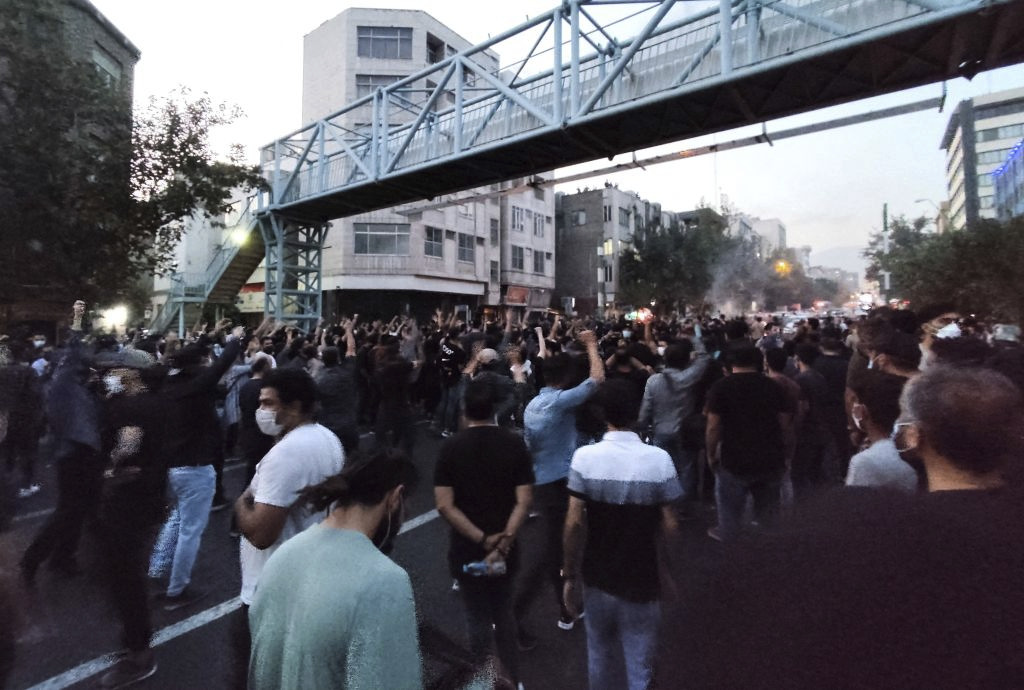 Sur la photo: des Iraniens protestent contre le meurtre de Mahsa Amini, 22 ans, assassinée par la police alors qu’elle était en garde à vue, à Téhéran, le 21 septembre 2022. (Photo de l’AFP via Getty Images)