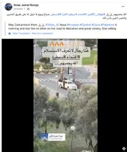 Une autre, montrant une photo des terroristes du Hamas en Israël, dit : « Que Dieu les protège. Inondation #alAqsa… Un matin et un jour pas comme les autres sur le chemin de la libération et de la grande victoire, si Dieu le veut.