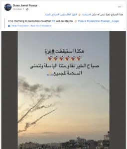 Et un autre message, dans lequel Rouqa célèbre les roquettes tirées sur Israël, contient une image montrant des traînées de fumée au-dessus de Gaza et une légende qui dit en arabe : « C’est ainsi que Gaza s’est réveillée. Bonjour à notre courageuse résistance. Nous souhaitons à tous la santé. La phrase au-dessus de l’image dit : « Ce matin à Gaza n’a pas d’équivalent. #pour toujours #Gaza #Palestine #un matin de fierté.