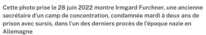 Allemagne: une ex-secrétaire d’un camp nazi condamnée à deux ans de prison avec sursis.