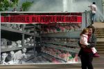 Une autre montre un tas de corps d'êtres humains nus, près d'un cliché illustrant un monceau de carcasses de porcs
