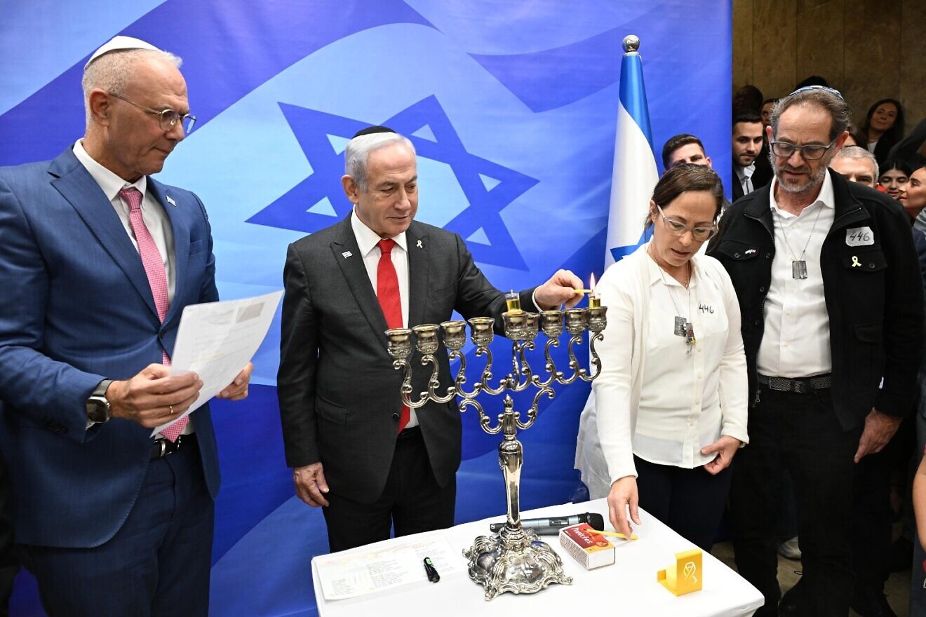 Le Premier ministre israélien Benjamin Netanyahu allume la ménorah le premier soir de Hanoucca à son bureau à Jérusalem, le 25 décembre 2024. Photo de Haim Zach/GPO.