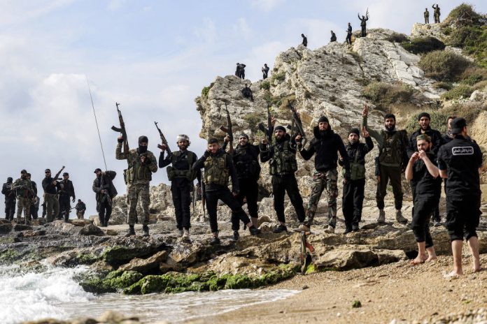 Photo : Des djihadistes fidèles à al-Sharaa célèbrent sur une plage de Lattaquié le 9 mars 2025, après le massacre de la ville. (Photo d’Omar Haj Kadour/AFP via Getty Images)