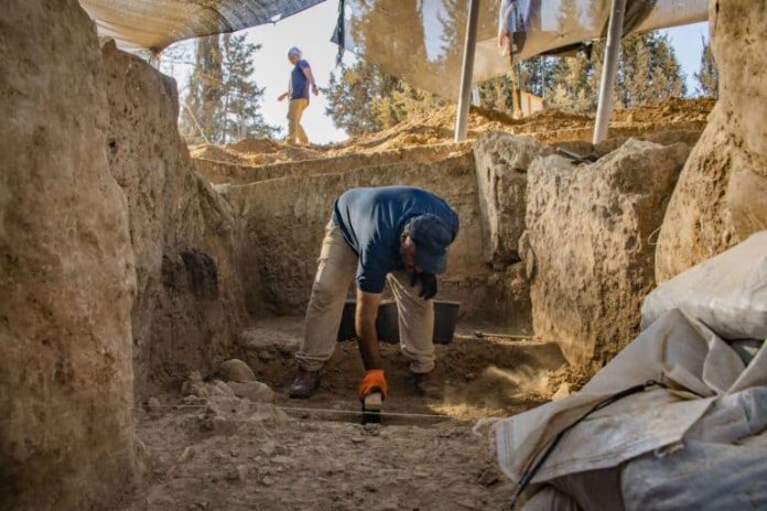 Fouilles à Tel Erani. Photo de Yoli Schwartz/Autorité israélienne des antiquités. D’autres parties des murs de la ville, entourant une ville qui couvrait 150 dunams (37 acres), ont été découvertes lors de fouilles précédentes.