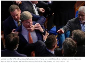 Les minutes suivantes s’inscrivent déjà dans l’histoire parlementaire des Etats-Unis. Livide, Kevin McCarthy s’approche de Gaetz pour tenter de le raisonner. Plus tôt dans la journée, l’élu insolent de Floride l’a pourtant qualifié de « LeBron James [basketteur vedette] des levées de fonds pour intérêts particuliers », estimant que « l’altruisme ne consiste pas à se vendre pièce par pièce à la corporation des lobbys ». McCarthy s’éloigne, résigné. Un élu républicain est physiquement retenu par un de ses collègues, pour ne pas s’en prendre à Matt Gaetz. Faute d’alternative, une suspension de séance est décidée par vote jusqu’à lundi, promettant un week-end de déchirements. C’est alors qu’une nouvelle confusion se produit près de l’estrade du speaker.