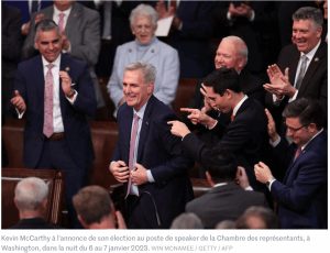 Malgré l’épuisement, Kevin McCarthy peut exulter, sous les applaudissements soulagés de ses collègues, criant « USA ! USA ! » Avec 216 voix contre 212 au démocrate Hakeem Jeffries, il s’empare enfin du marteau du speaker, succédant à Nancy Pelosi. En ce moment précis, un sourire éclatant sur le visage, il reboutonne sa veste, pose le marteau, apprécie les salutations des siens, et lâche : « C’était facile, hein ? » Dans son premier discours au perchoir, le vainqueur a promis que la nouvelle Chambre se consacrerait à deux défis de long terme : « la dette et la montée en puissance du Parti communiste chinois ». Le nouveau speaker a aussi annoncé un premier vote, dès lundi matin, visant à supprimer le financement pour recruter de nouveaux agents du fisc. « Le travail difficile commence maintenant », a-t-il estimé.