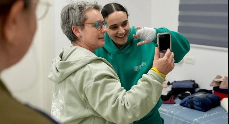 L’otage du Hamas Emily Damari, la main bandée, avec sa mère, Mandy, après avoir été libérée dans le cadre d’un accord de cessez-le-feu, dimanche 19 janvier 2025 (GPO Israël)