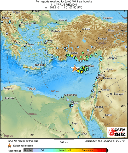 M6.3 #earthquake (#σεισμός) strikes 131 km W of #Nicosia (#Cyprus) 14 min ago. Updated map of its effects: pic.twitter.com/rz3UIXwYEs
