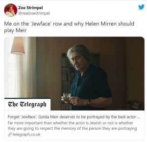Lipmann l’a précisé au Jewish Chronicle : le talent de Helen Mirren – qui a reçu en 2006 l’oscar de la meilleure actrice pour son interprétation d’Élisabeth II dans The Queen de Stephen Frears – n’est pas en cause. “Je suis persuadée qu’elle sera excellente dans le rôle [de Golda Meir], souligne-t-elle. Mais jamais on ne permettrait à Ben Kingsley [un acteur britannique d’origine indienne] de jouer Nelson Mandela. Ce ne serait tout simplement pas envisageable.”