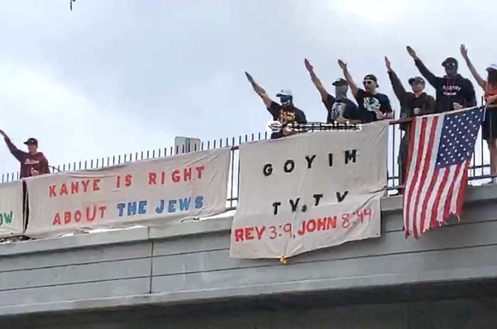 Oren Segal, vice-président du Centre ADL sur l’extrémisme, a tweeté dimanche une image de suprématistes blancs faisant le salut nazi sur un viaduc, debout au-dessus d’une banderole sur laquelle on peut lire « Kanye a raison à propos des Juifs ».
