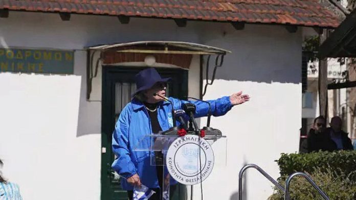 Esther Yaron prend la parole à l’ancienne gare de Thessalonique, en Grèce, lors d’un événement marquant les 80 ans de la déportation des Juifs de la ville, le 19 mars 2023. Crédit : avec l’aimable autorisation.