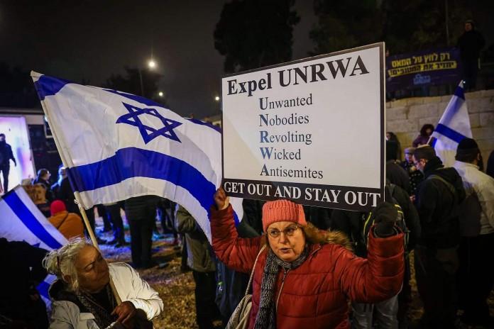 Crédit photo : Chaim Goldberg / Flash 90 Des Israéliens protestent contre l’Office de secours et de travaux des Nations Unies pour les réfugiés de Palestine dans le Proche-Orient (UNRWA) dans leurs bureaux à Jérusalem, le 5 février 2024.